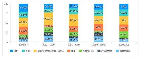 对于功能的选择上,用户的一致程度比较高,即使控制了收入变量,可以看到,在各收入层级的人群中,“功能(身体情况监测)”是占比最多的原因。
