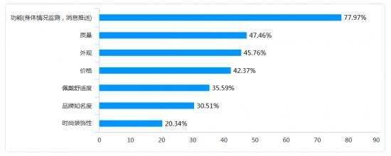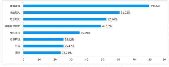 从具体功能上看,用户对“健康监测”的关注程度最高,占比为79.66%,其次分别为“续航能力”(61.02%)和“防水能力(52.54%)”。