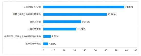 我们的调查数据显示,从没有使用过智能手环(手表)的人群中,78%的人认为是因为“手机功能已经足够”,60.98%的人群认为手环(手表)的功能没有吸引力,甚至认为“使用不方便”的比例都有36.59%。