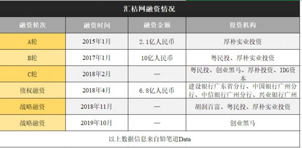 其发展背后也不乏资本助推,算得是资本眼中的明星企业。过去7年,汇桔网完成了6轮融资,除去3轮尚未披露金额,另外3轮的融资总额就累计多达18.9亿元人民币,其估值在2018年就号称超过100亿人民币,并登上《2018胡润全球独角兽榜》。