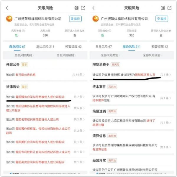 据天眼查显示,“广州博鳌纵横”自身风险包括67条,且该公司曾因服务合同纠纷而被他人或公司起诉的有7条,且公司创始人谢旭辉被法院列为限制高消费人员,成为“老赖”。