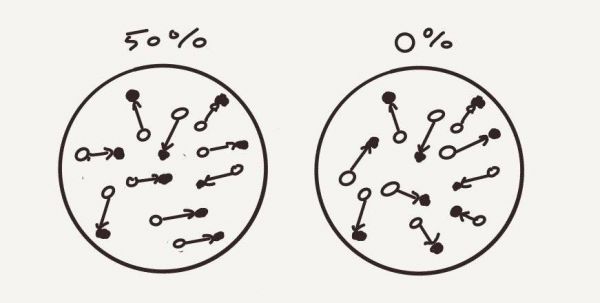 动点任务的两个简图示例。左边的是简单的版本:一半的点都在向右动,其余的在随机动。右边的则是一个不可实现的任务:没有哪个点在同向移动,所以观察者只能猜 (他们不知道难度)。点都是从空心圈向实心圈的方向移动。—THE SPIKE
