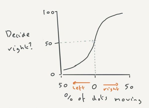 难度系数的S型曲线。任务越简单,犯错概率越小。横轴代表向左或向右移动的点的百分比。纵轴代表被试者为对应的动点百分比选择向“右”移动的百分比。当动点明显在向左移动时,人们很少会错误判断它们在向“右”动。当没有同向移动的点时(0%),那么结果就是纯猜测的概率。—THE SPIKE