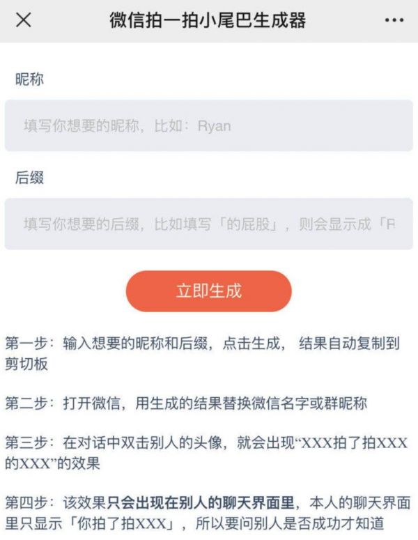 为了让大家更便捷地参与这个游戏,甚至有热心网友火速开发出了一个微信“拍一拍”小尾巴生成器。