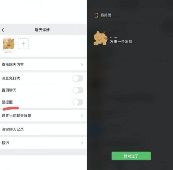 你可以在微信好友的聊天详情里,打开“强提醒”。开启后,这个联系人的消息就可能会在微信的聊天界面全屏显示。如果你开启了震动模式,当你打开微信时,手机还会不停震动,直到你点击了“我知道了”为止。这个强提醒的功能仅限联系人三小时内的第一条消息。