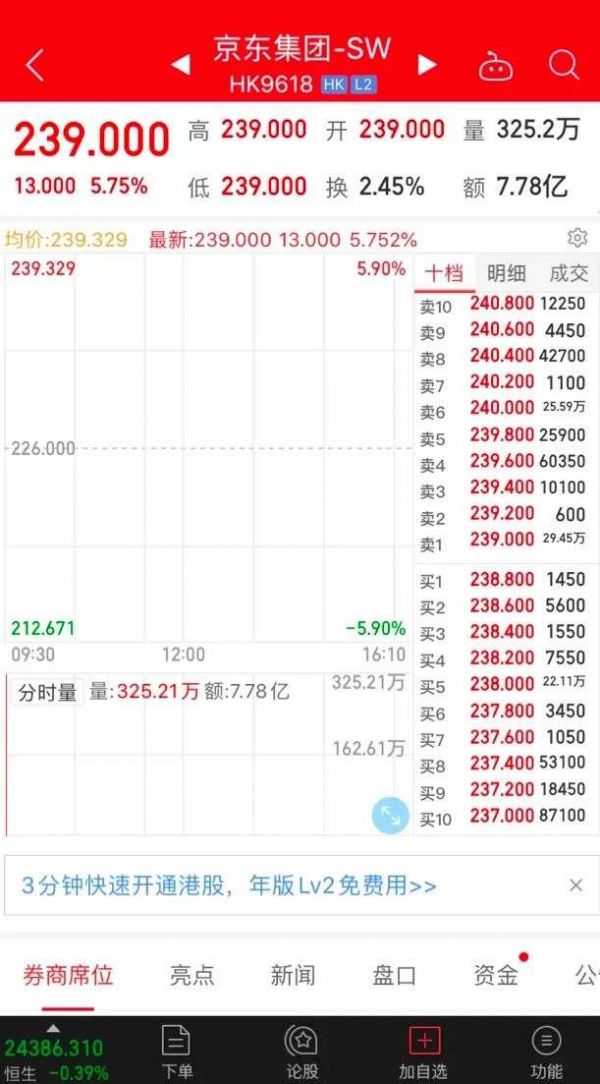 6月18日,京东正式在港交所挂牌交易,代码为“9618.HK”,发行价为226港元/股,开盘涨5.75%报239港元,按开盘价计算,京东港股市值达7432.62亿港元。