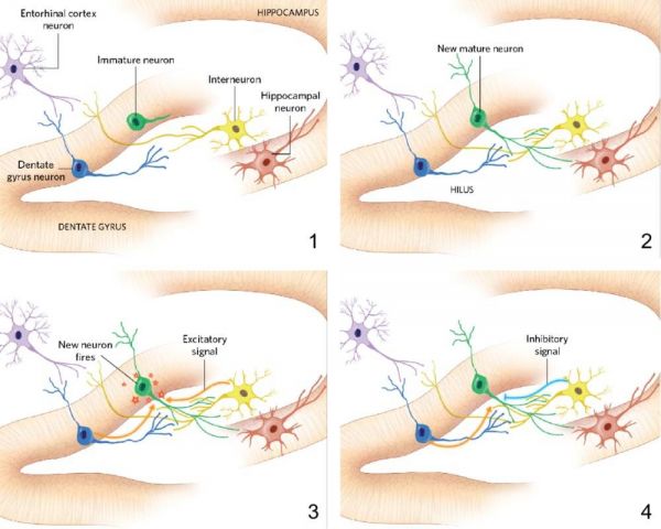 图3:新生神经元整合入大脑神经网络过程示意图。(1)神经干细胞分裂形成一个新的神经元(绿色)。(2)新生神经元不断生长,从水平方向旋转到垂直方向,连接到位于齿状回的一个中间神经元(黄色),并逐渐与已成熟的齿状回神经元(蓝色)及海马体神经元(红色)建立联系。(3)一旦突触形成,已成熟神经元将信号发送到新生神经元,后者也开始自主产生信号。在形成大约四周左右,新生神经元会高度兴奋,将比已成熟神经元更频繁地发送信号。(4)随着新生神经元与更多神经元产生连接,中间神经元也开始抑制其活动。Dentate gyrus,齿状回;Entorhinal cortex neuron,内嗅皮层神经元;Hippocampus/hippocampal neuron,海马体/海马体神经元;Immature neuron,未成熟的新生神经元;Interneuron,中间神经元。