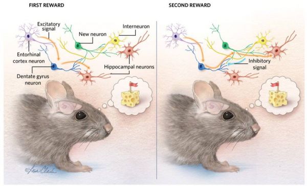 2014年,Paul Frankland团队的研究表明,当大脑产生更多新生神经元时,小鼠会变得更加健忘。他和同事先让小鼠做跑轮运动以刺激神经发生,再训练小鼠做学习任务。结果不出所料:进行过锻炼的小鼠比未进行锻炼的小鼠学得更好[2]。而在另一组实验中,研究人员让小鼠先学习,在认为信息已经储存(至少短期储存在海马体)之后,再令其运动以刺激神经发生。然而令人吃惊的是,在学习之后再刺激神经发生,小鼠的记忆力却大幅下降了。