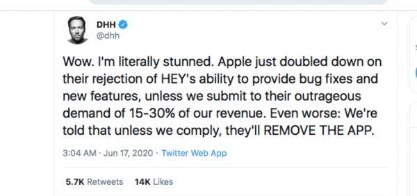 其中,苹果抽成一事成为一大争议点。Basecamp联合创始人兼首席技术官David Heinemeier Hansson发推特公开表示受到了苹果的施压,并形容苹果为“黑社会”:“我太震惊了。苹果就在刚刚加倍拒绝了我们修护hey漏洞和上新功能的请求,除非,我们向苹果交付我们营收的15%-30%。更糟糕的是,他们还说,如果我们不被遵从,他们会移除这款应用。”