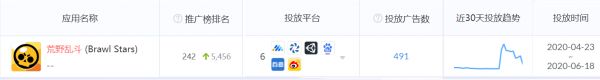 作为Supercell的重磅手游,腾讯对这款游戏的推广不遗余力。据移动营销数据分析平台App Growing监测,截至6月18日,《荒野乱斗》广告投放共计24天,按照广告投放数量统计,其在整体App推广榜中排名飙升。