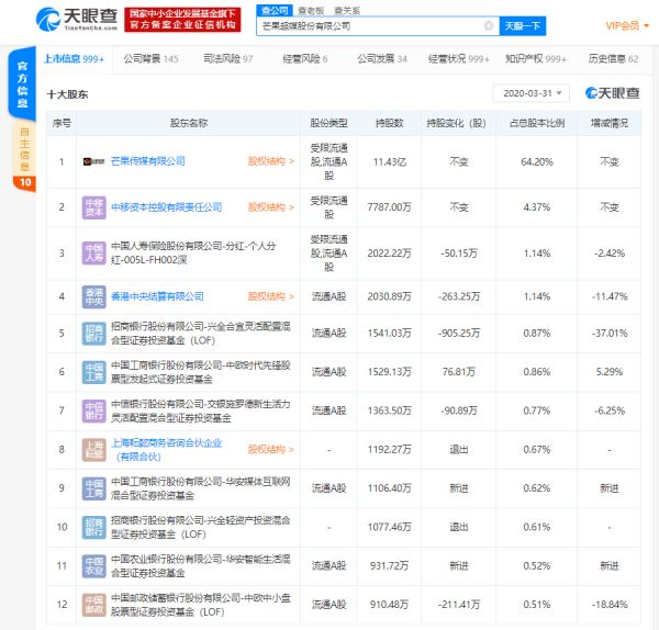 天眼查十大股东数据显示,该公司的最大股东为芒果传媒有限公司,持股比例64.20%,后者由湖南广播电视台100%持股;第二大股东为中移资本控股有限责任公司,持股比例4.37%,后者由中国移动通信集团有限公司100%持股。