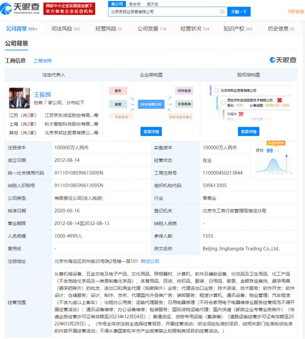 北京京邦达贸易有限公司成立于2012年8月,注册资本10亿人民币,法定代表人为京东物流CEO王振辉,公司经营范围包括国内快递(邮政企业专营业务除外);普通货运、货物专用运输(集装箱);代理进出口业务等,由西安京东信成信息技术有限公司全资控股,后者的最大股东为刘强东本人,持股比例为45%。