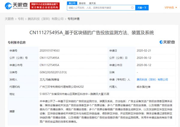 网易科技讯 6月18日消息,天眼查数据显示,近日,腾讯科技(深圳)有限公司新增多条与区块链相关专利,包括基于区块链网络的消费方法、装置,基于区块链进行基金管理的方法、装置及存储介质,基于区块链的广告投放监测方法、装置及系统等。