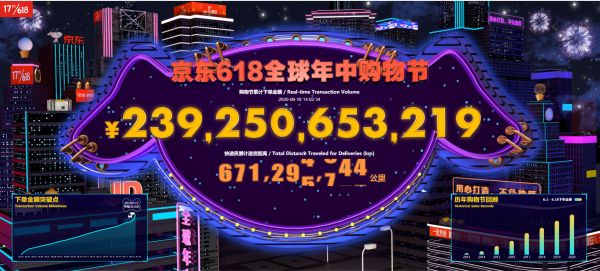 网易科技讯 6月18日消息,京东618年中购物节最新销售数据:从6月1日0点到6月18日下午两点,累计下单金额达到2392亿。6月18日9:47,京东累计下单金额达到2284.88亿元,超过去年618大促18天2015亿元的纪录。