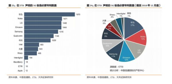 5G标准专利数统计,资料来源:中国信通院、ETSI、天风证券研究所