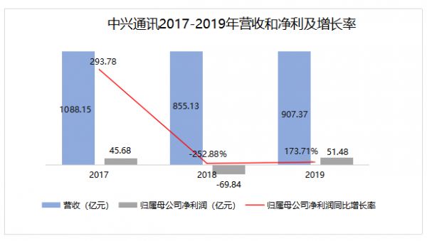 凭借5G基站的加速推进,中兴通讯业绩在2019年出现翻转。年报显示,2019年中兴营业收入907.37亿元,净利润同比增长173.71%,净利润还创下历史最高水平的51.48亿元。