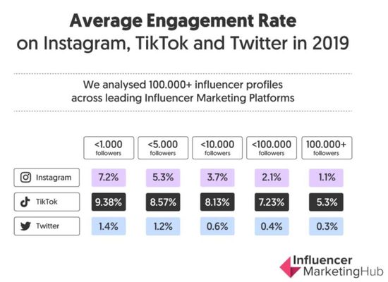 相比Instagram和推特,TikTok的2019年的用户参与度最高。