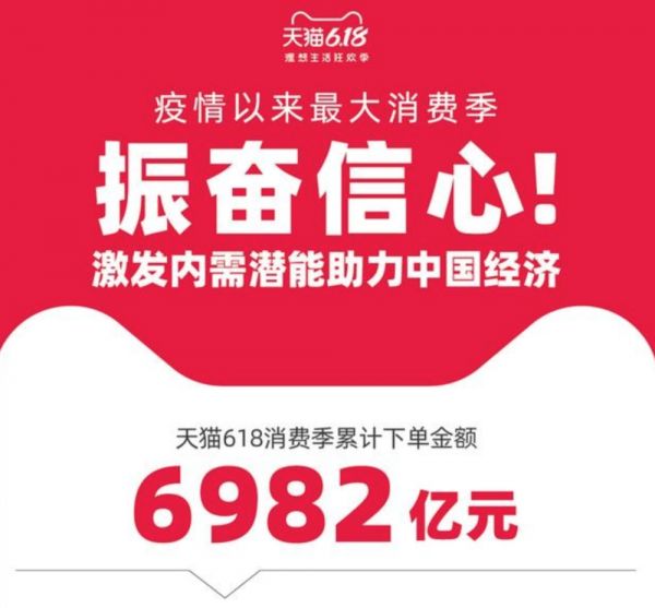 @IT之家【阿里宣布:天猫 618 累计下单金额达到 6982 亿元】 北京时间6月19日凌晨,阿里巴巴宣布,作为疫情以来最大的消费季,2020年天猫618的累计下单金额为6982亿,创造新纪录。