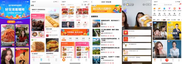 图:直播入口从左至右依次为:支付宝、饿了么、口碑、美团、美团外卖、大众点评