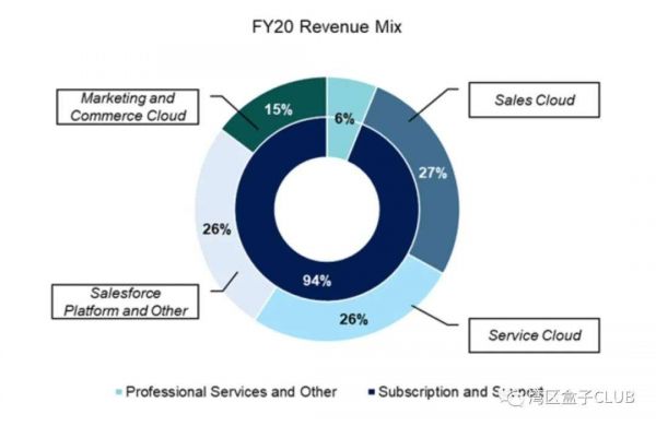 如果继续细分,可以将其产品分为4个产品组:Sales Cloud,Service Cloud,Salesforce Platform和其他以及Marketing and Commerce Cloud。