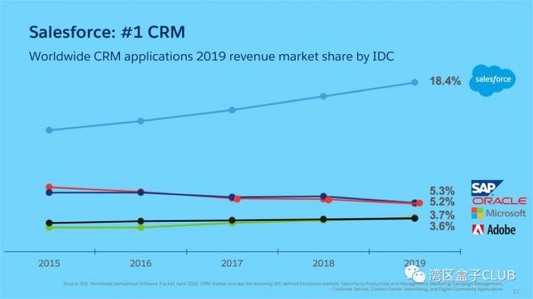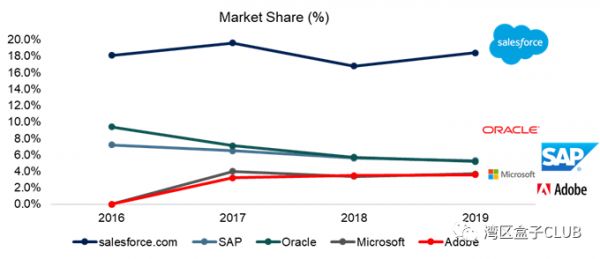 在过去的几年中,该公司已经将其产品组合扩展到其核心Sales Cloud(最大最主要的云CRM软件)以外的领域。但Salesforce最赚钱的业务依然还是在Sales Cloud这块业务上,它为Salesforce的20财年收入贡献了29%。同时,Salesforce的Marketing Cloud贡献了另外16%的收入。Salesforce 在CRM领域的市场占比很高。