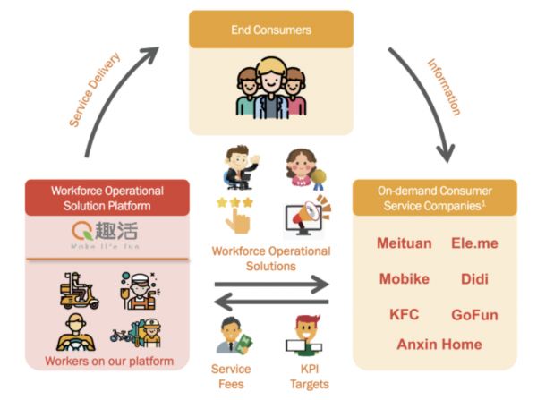 趣活的角色,相当于平台与消费者之间的连接者,通过对劳动力的调配与管理,将平台提供的商品与服务传递给消费者。