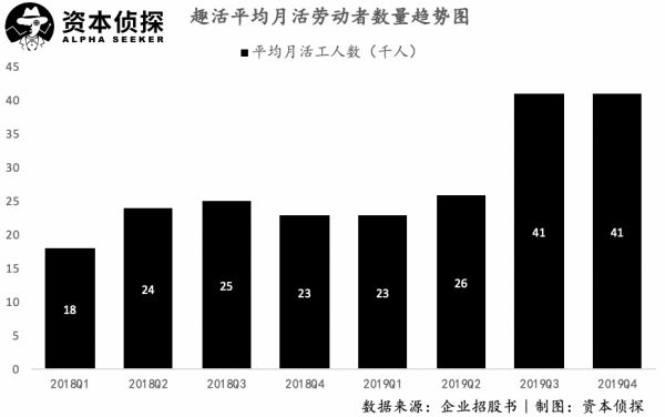 平台上劳动者人数是决定趣活业务水平的关键指标,从招股书披露的数据来看,这一指标在2019年下半年有较大幅度增长,平台劳动者突破4万人。招股书提到,以2019年平均月活跃劳动者数计,趣活是国内最大的劳动力运营解决方案平台。