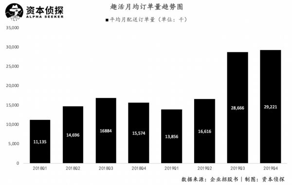 趣活的订单量与劳动者数量保持了同步增长趋势,2019年Q3、Q4,其月均订单量分别达到了2.87亿和2.92亿,同比增长70%和88%。