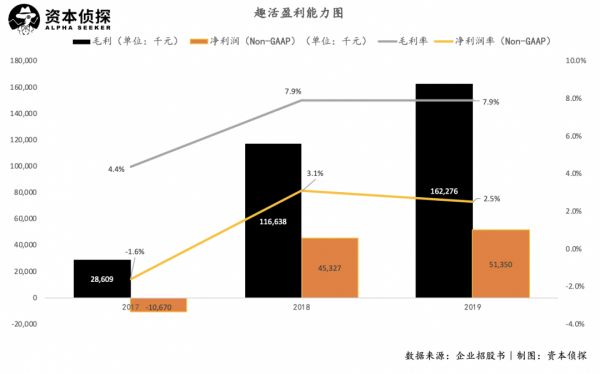 趣活2019年实现毛利润1.6亿元,毛利率不足8%,而其在2017年毛利率低至4.4%;