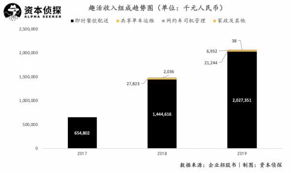 目前,趣活的业务包含即时餐饮配送、共享单车运维、网约车司机管理、家政及其他四大模块,其中餐饮配送业务占极大比例,几乎贡献了全部营收。2019年,趣活实现营收20.6亿元,其中即时餐饮配送业务营收占比达到98.6%,从这一角度讲,趣活的业务几乎可以与外卖骑手运营管理划上等号。