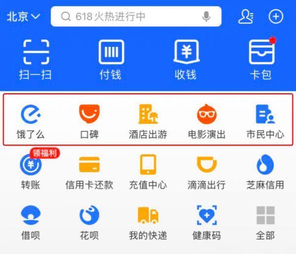 今年3月,支付宝宣布升级为数字生活开放平台:新增外卖到家、果蔬商超医药等生活服务版块、外卖、美食/玩乐、酒店住宿、电影演出和市民中心五大模块被置顶。