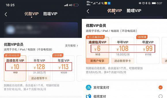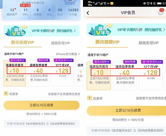 腾讯视频VIP,左:iOS端;右:安卓端 不少用户认为,明明是同一种服务,针对不同手机操作系统却实行不同的销售价格,这种行为属于价格歧视。