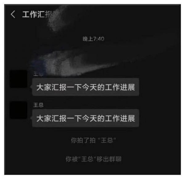 我拍了拍“张三”,“李四”拍了拍“自己的肚腩”,“王五”拍了拍“三天未洗的头发”,我拍了拍“孙总”,然后被孙总移出了群聊。
