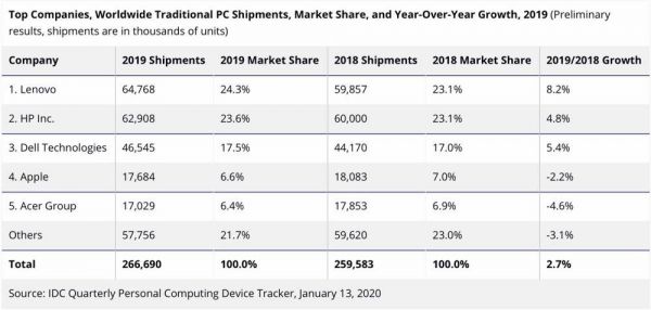 根据 IDC 的统计,2005 年苹果电脑的出货量为 217 万台,而在 2019 年这个数字达到了 1768 万台。这其中固然有笔记本电脑市场整个市场的扩大,但 Mac 的市份额仍然提升到了之前的两倍。