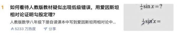 6 月 17 日晚间,一位匿名的知乎用户发布提问“如何看待人教版教材疑似出现低级错误,用爱因斯坦相对论证明勾股定理?”,提到在人教版数学八年级下册的自读课本中,出现了“爱因斯坦对勾股定理的证明”的相关内容。