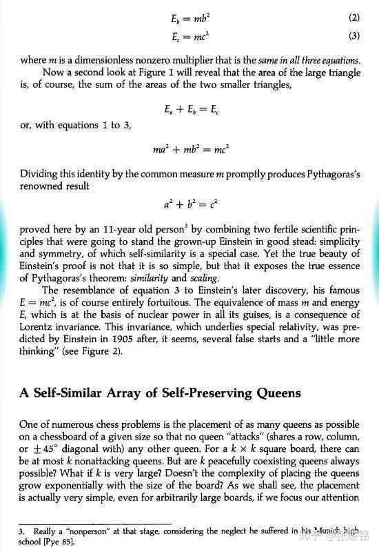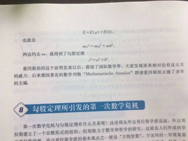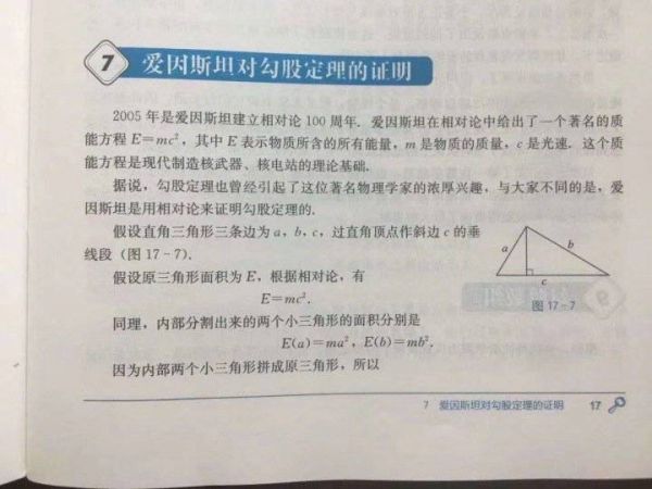 教材上这样写道:“2005 年是爱因斯坦建立相对论 100 周年,爱因斯坦在相对论中给出了一个著名的质能方程 E=mc²,其中 E 表示物质所含的所有能量,m 是物质的质量,c 是光速,这个质能方程是现代制造核武器、核电站的理论基础。”紧接着话锋一转,这本教材展示了爱因斯坦用相对论证明勾股定理的详细过程:
