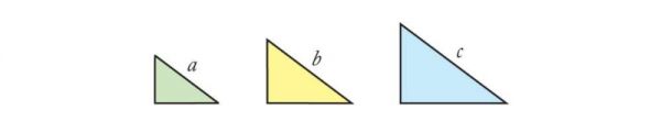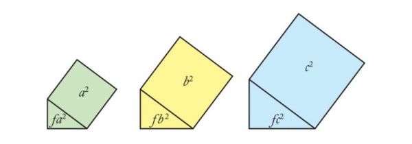 因为它们对应的角是相等的,对应的边长也是等比的,所以我们称之为“相似”。因此,这三个三角形的面积可表示为 fc、fa、fb,显然 fc=fa+fb。