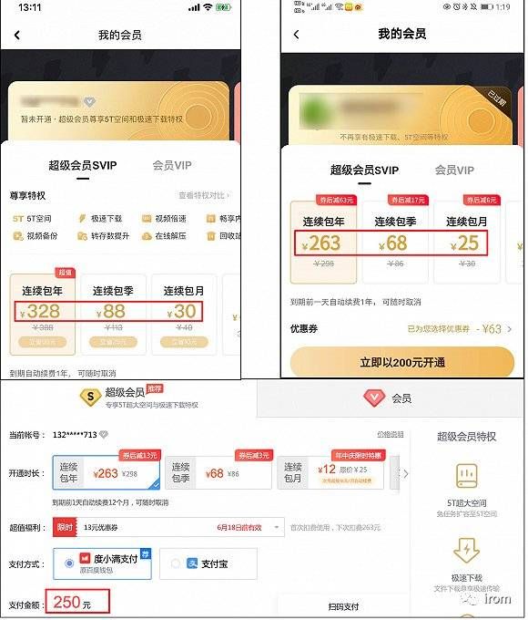 以单价最高的包年会员价格为例,iOS端的百度网盘超级会员定价328元;在安卓手机上价格为263元,叠加年中特惠优惠券后,支付价为200元;而在网页端,使用了同样的优惠券后,价格为250元。三种平台,最高价与最低价之间相差了128元。