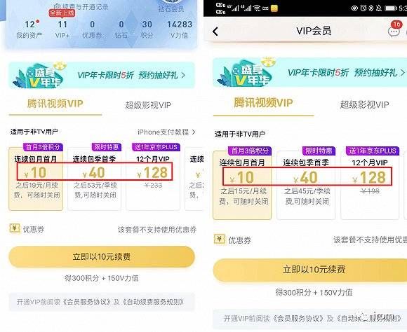 腾讯视频VIP,左:iOS端;右:安卓端