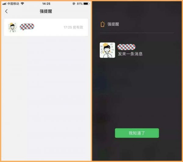 在这两年,微信的提醒界面开始尝试进行分级。在7.0.0版本中,微信加入了“强提醒”功能,你可以设置特别用户进行消息关注,在他的信息到来之际,微信将会全屏显示提醒消息,之后就会消失,这增强了亲密人物的信息优先级,提高信噪比。