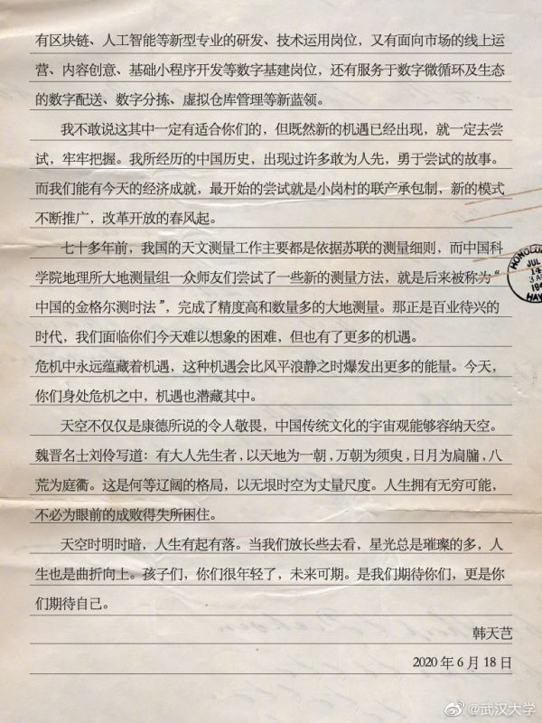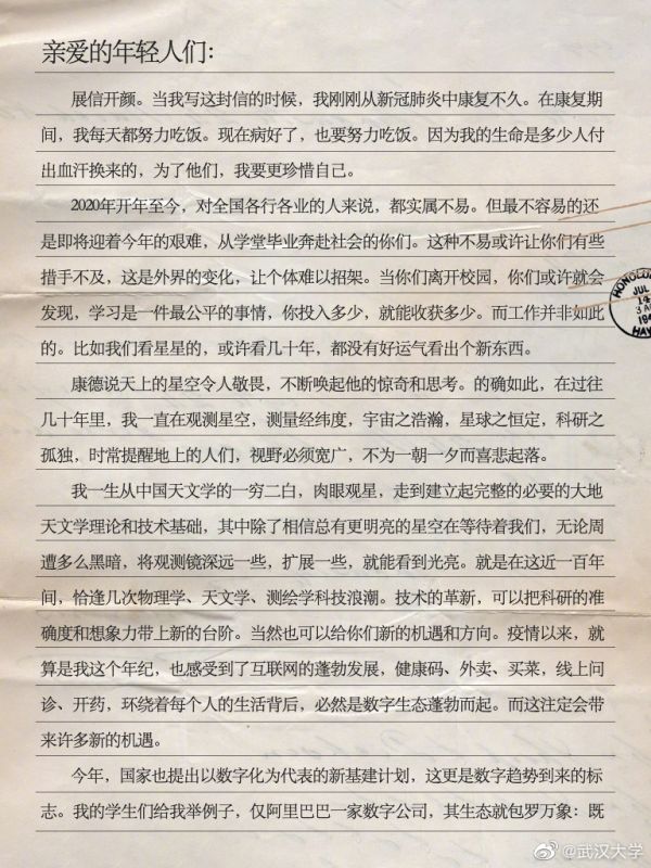 6月20日,武汉大学召开了一场特殊的毕业典礼,因为疫情,不少学生只能通过视频参加。为了勉励这些毕业生,20日武汉大学发布了从新冠肺炎中痊愈的天文学泰斗韩天芑给毕业生写的信。信中韩天芑勉励毕业生们不要为一朝一夕而喜悲起落,要努力抓住机遇。