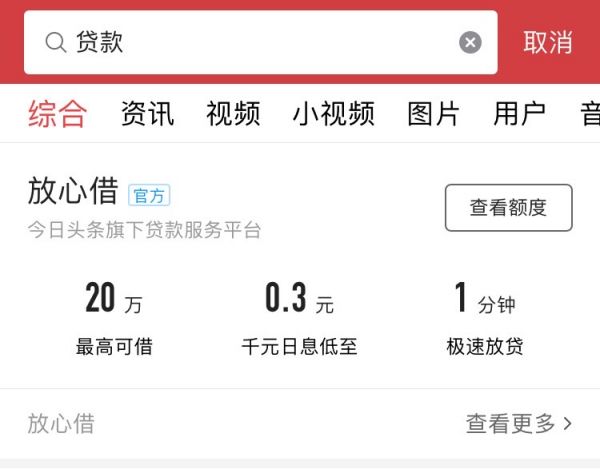 目前,只要在今日头条APP搜索“贷款”两字,置顶显示的就是旗下贷款服务平台“放心借”,并注明为今日头条官方产品。