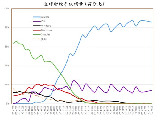 图注:各移动操作系统在全球的市场份额。