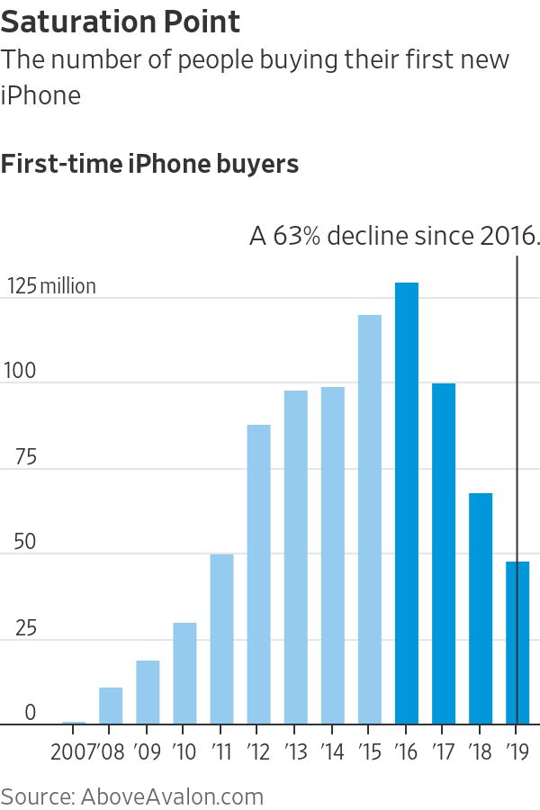 图示:自2016年达到1.29亿人的历史峰值以来,首次购买iPhone的人数每年都在下降。2019年这一数字较峰值已经下降63%。