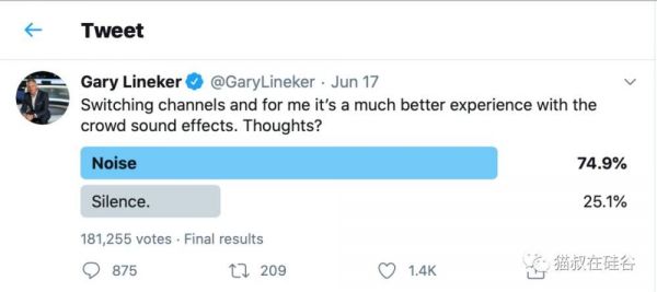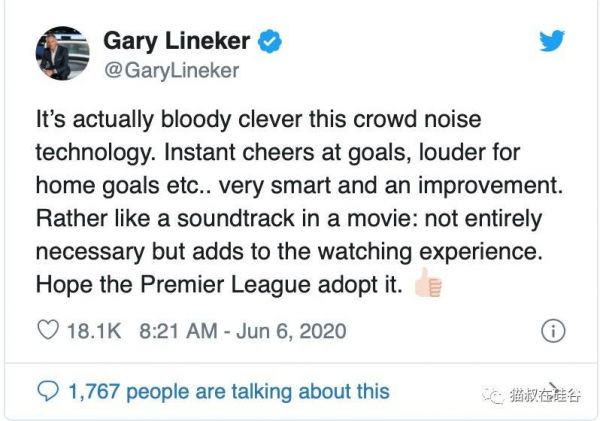 莱因克尔是背景噪音技术的大力倡导者。他表示,这是非常聪明的技术,在进球的时候立刻会有欢呼声,主队进球时欢呼声更加响亮。这就像是电影的配乐,并不是必须的,但却可以提升观影体验。BT Sport联合创始人汉弗莱(Jake Hamphrey)直截了当的说,(疫情下的职业赛事转播)体验不可能再和之前完全一样,所以我们只能尽力而为。