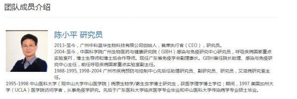 中科蓝华官网显示,陈小平为该公司创始人、首席执行官(CEO)。原中科院广州生物医药与健康研究院感染与免疫研究中心副研究员、陈小平任呼吸疾病国家重点实验室副主任时的课题组研究骨干之一秦莉为该公司首席技术官(CTO)、CEO助理。2015年毕业于陈小平课题组的博士胡文现为中科蓝华基因编辑部项目首席科学家、副研究员。