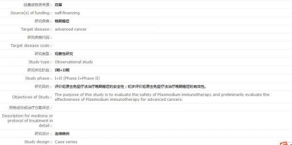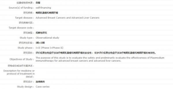 第二个注册项目为“疟原虫免疫疗法治疗晚期癌症的临床研究”(注册号ChiCTR-OIC-17013921,状态为“补注册”),注册时间为2017年12月14日,项目研究负责人为陈小平。该项目由中国注册临床试验伦理委员会于2017年9月24日批准同意,研究目的为评价疟原虫免疫疗法治疗晚期癌症的安全性;初步评价疟原虫免疫疗法治疗晚期癌症的有效性。