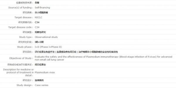 该项目的伦理委员会批件附件显示,项目于2015年12月21日由广州医科大学附属第一医院医学伦理委员会 批准同意。该研究目的为评价疟原虫免疫疗法(血源感染良性间日疟)治疗晚期非小细胞肺癌的安全性和有效性,研究实施地点为广州医科大学附属第一医院(三级甲等)。招募志愿者80人,经费或物资来源显示自筹。