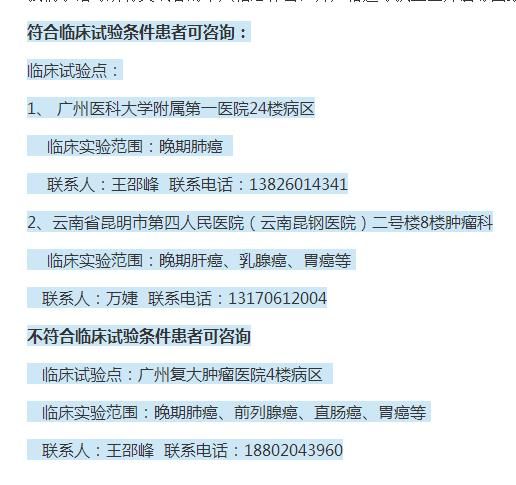 临床试验地点即为上述三个项目所实施的广州医科大学附属第一医院、云南昆钢医院、广州复大肿瘤医院。临床实验范围包括晚期肺癌、晚期肝癌、乳腺癌、胃癌、前列腺癌、直肠癌等。