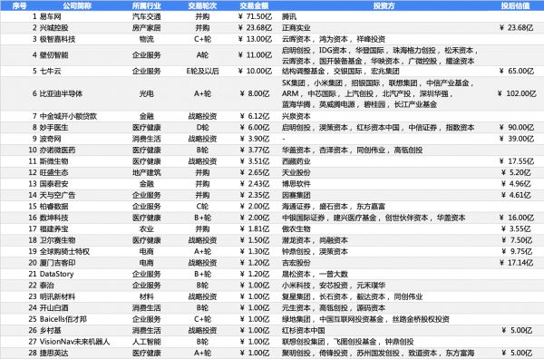 从融资轮次看,项目集中在战略投资、并购和A 轮,其中战略投资18笔、并购16笔、A轮融资9笔。其中战略投资相比上周(15笔)数量略有增加。